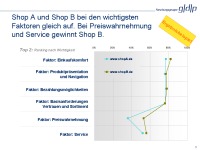 Untersucht wurden die bekanntesten und am häufigsten genutzten Online Shops für Parfüm- und Drogerieprodukte. Detail-Auswertungen sind für folgende Shops in der Studie enthalten: www.douglas.de, www.yves-rocher.de, www.schlecker.de, www.karstadt.de und www.parfumdreams.de. Tendenzergebnisse sind in der Studie für viele andere Online Shops in der Studie ausgewiesen.